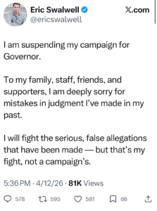 - Eric Swalwell, Democrat, U.S. Representative from the Bay Area Campaign is Suspended as of 4-/12/26